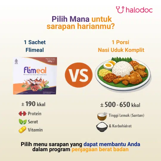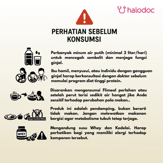 Mengandung bahan Alami Tinggi Protein (30%) dan Serat (15%) seperti kacang-kacangan, kedelai isolat, dan chia seed, Flimeal berfungsi sebagai minuman pengganti sarapan untuk memenuhi kebutuhan nutrisi serta energi harian Anda tanpa berpengaruh terhadap peningkatan berat badan Anda.
