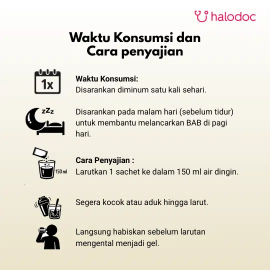 2 sachet per hari (1-2 jam sebelum makan) selama 7 hari. Lalu bisa dilanjutkan dengan 1 atau 2 sachet per hari untuk menjaga kesehatan.