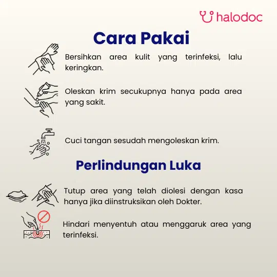 Oleskan tipis-tipis pada area kulit yang terinfeksi setelah dibersihkan. Dapat ditutup dengan kasa steril jika perlu. Cuci tangan sebelum dan sesudah mengoleskan krim.