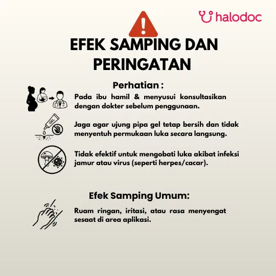 Efek samping yang mungkin terjadi bersifat lokal pada kulit, seperti rasa perih ringan, iritasi, gatal, atau ruam pada area yang dioleskan.