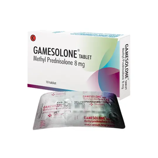 GAMESOLONE 8 adalah obat yang mengandung Methylprednisolone, suatu glukokortikoid sintetik turunan prednisolon. Obat ini memiliki efek antiinflamasi dan imunosupresif yang poten. Mekanisme kerjanya melibatkan ikatan dengan reseptor glukokortikoid intraseluler, yang setelah teraktivasi akan berikatan dengan daerah promotor DNA. Proses ini memodulasi transkripsi gen, baik mengaktivasi maupun menekan ekspresi gen tertentu, termasuk melalui deasetilasi histon, sehingga mengakibatkan penurunan produksi mediator inflamasi. PREDNICORT secara klinis diindikasikan untuk penanganan berbagai kondisi alergi dan inflamasi yang memerlukan terapi glukokortikoid, seperti pada penyakit autoimun, gangguan pernapasan, serta kondisi dermatologis dan reumatologis. Dalam menggunakan obat ini HARUS SESUAI DENGAN PETUNJUK DOKTER. Pembelian obat ini memerlukan edukasi terkait penggunaan atau pengonsumsian obat yang tepat dan aman yang akan dikenakan biaya.