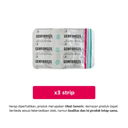 GEMFIBROZIL 300 MG 10 KAPSUL digunakan untuk membantu menurunkan kadar lemak (lipid) trigliseride di dalam tubuh sehingga bisa mencegah penyakit jantung dan masalah sirkulasi darah lainnya. Dalam penggunaan obat ini HARUS SESUAI DENGAN PETUNJUK DOKTER. Pembelian obat ini memerlukan edukasi terkait penggunaan atau pengonsumsian obat yang tepat dan aman yang akan dikenakan biaya.