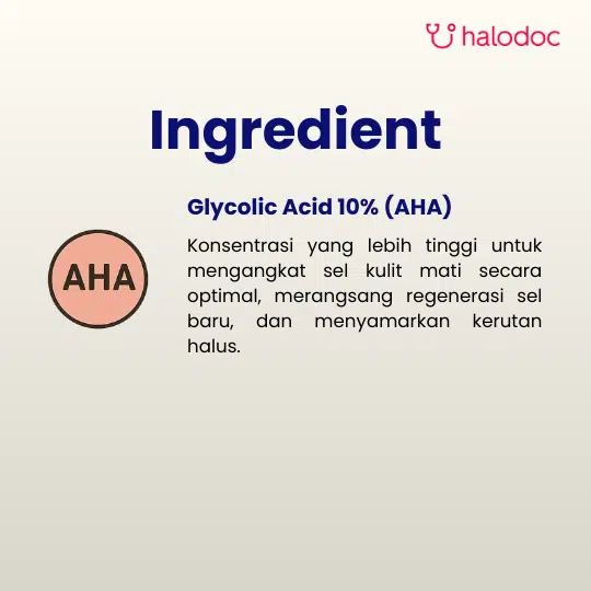 Produk ini mengandung asam glikolat yang dapat menyebabkan iritasi ringan pada beberapa jenis kulit, terutama pada awal pemakaian. Hindari area mata dan membran mukosa. Gunakan tabir surya selama pemakaian. Hentikan penggunaan jika terjadi reaksi iritasi berlebih dan konsultasikan dengan tenaga medis.