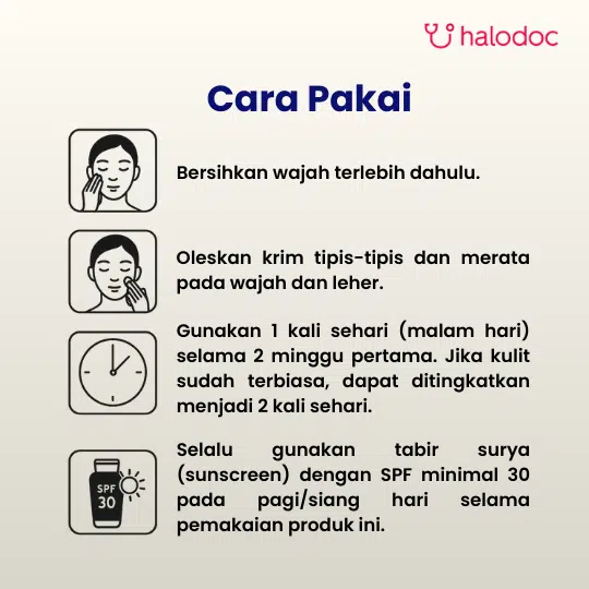 2 minggu pertama: Oleskan 1 kali sehari pada wajah dan leher setelah dibersihkan.