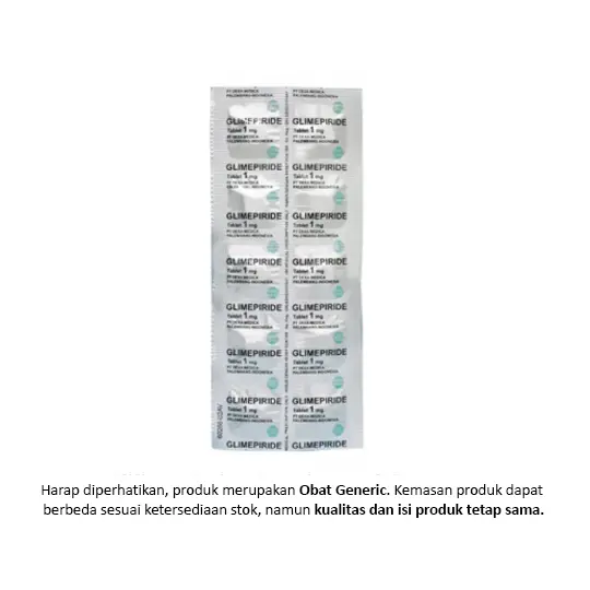 Glimepiride 1 mg merupakan obat anti diabetes yang termasuk ke dalam golongan sulfonilurea. Glimepiride digunakan sebagai obat yang digunakan sebagai tambahan untuk menurunkan kadar glukosa darah pada pasien diabetes mellitus tipe 2 (Non-Insulin-Dependent Diabetes Mellitus/NIDDM)) yang tidak dapat dikontrol hanya dengan perubahan gaya hidup (diet dan olahraga). Obat ini bekerja dengan merangsang pelepasan insulin dari sel beta pankreas yang masih berfungsi dan meningkatkan sensitivitas jaringan terhadap insulin. Obat ini dapat digunakan sebagai terapi tunggal atau dikombinasikan dengan obat anti diabetes oral lain atau insulin. Obat ini tergolong Obat Keras (HARUS DENGAN RESEP DOKTER). Dalam pembelian produk ini, Anda akan diarahkan untuk melakukan sesi edukasi singkat dengan Dokter kami mengenai penggunaan yang tepat dan aman. Sesi ini akan dikenakan biaya layanan.