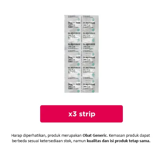 GLIMEPIRIDE TABLET merupakan obat anti diabetes yang termasuk ke dalam golongan sulfonilurea. Glimepiride digunakan sebagai obat anti diabetes mellitus tipe 2 atau Non-Insulin-Dependent (type II) Diabetes Melitus (NIDDM) dimana kadar glukosa darah tidak dapat hanya dikontrol dengan diet dan olahraga saja. Glimepiride bekerja dengan menurunkan kadar gula darah dengan merangsang pelepasan insulin dari sel beta pankreas yang masih berfungsi. Obat ini juga dapat meningkatkan sensitivitas jaringan perifer terhadap insulin. GLIMEPIRIDE digunakan sebagai terapi tunggal atau dikombinasikan dengan obat anti diabetes oral lain atau insulin. Dalam penggunaan obat ini HARUS SESUAI DENGAN PETUNJUK DOKTER. Pembelian obat ini memerlukan edukasi terkait penggunaan atau pengonsumsian obat yang tepat dan aman yang akan dikenakan biaya.