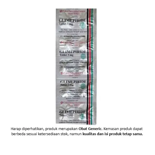 Glimepiride 3 mg merupakan obat anti diabetes yang termasuk ke dalam golongan sulfonilurea. Glimepiride digunakan sebagai obat yang digunakan sebagai tambahan untuk menurunkan kadar glukosa darah pada pasien diabetes mellitus tipe 2 (Non-Insulin-Dependent Diabetes Mellitus/NIDDM)) yang tidak dapat dikontrol hanya dengan perubahan gaya hidup (diet dan olahraga). Obat ini bekerja dengan merangsang pelepasan insulin dari sel beta pankreas yang masih berfungsi dan meningkatkan sensitivitas jaringan terhadap insulin. Obat ini dapat digunakan sebagai terapi tunggal atau dikombinasikan dengan obat anti diabetes oral lain atau insulin.