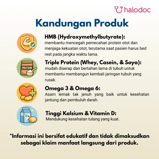 Seiring bertambahnya usia atau saat masa pemulihan, tubuh membutuhkan nutrisi spesifik untuk menjaga kekuatan otot. Produk ini mengandung HMB (Hidroksi Metilbutirat) yang lebih tinggi, suatu metabolit dari asam amino leusin yang terbukti secara klinis membantu mengurangi kerusakan otot dan menjaga massa otot. Formula ini diperkaya dengan Triple Protein (kombinasi Whey, Kasein, dan Soya) yang menyediakan asam amino esensial untuk membangun dan memperbaiki jaringan tubuh. Selain itu, produk ini mengandung Omega 3 & 6, 13 vitamin dan 9 mineral untuk mendukung fungsi tubuh secara keseluruhan dan menjaga daya tahan tubuh.