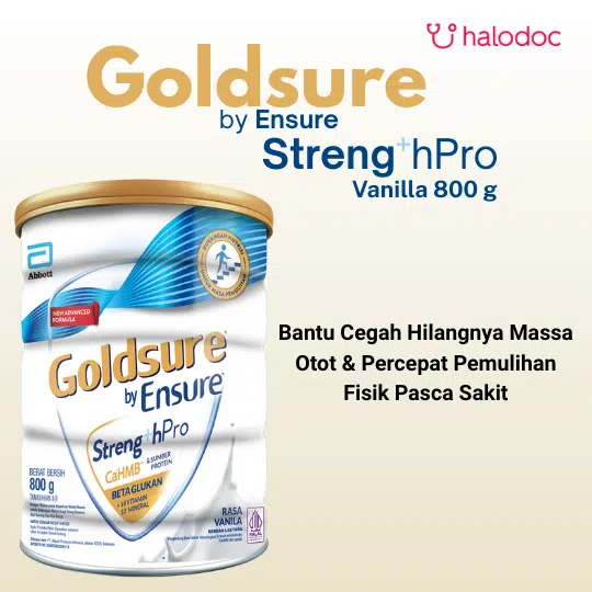 GOLDSURE BY ENSURE STRENGTH PRO adalah nutrisi dewasa lengkap dan seimbang yang diformulasikan secara ilmiah dengan kandungan HMB yang lebih tinggi. Produk ini dirancang sebagai pangan olahan untuk keperluan medis khusus guna mendukung kekuatan, daya tahan, dan energi untuk tetap aktif, terutama bagi mereka yang berada dalam masa pemulihan atau berisiko kehilangan massa otot.