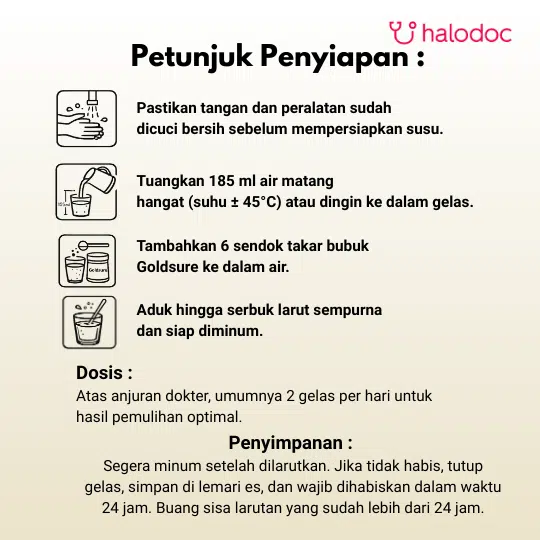 Untuk menyiapkan 1 sajian (230 ml), tuangkan 185 ml air matang dingin atau hangat ke dalam gelas. Secara bertahap tambahkan 6 sendok takar (rata) bubuk Goldsure sambil diaduk hingga larut.