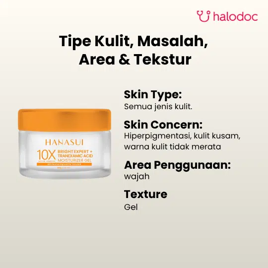 HANASUI BRIGHT EXPERT MOISTURIZER adalah pelembap wajah dengan tekstur gel ringan yang dirancang khusus untuk mencerahkan dan meratakan warna kulit. Produk ini membantu menyamarkan noda hitam serta masalah hiperpigmentasi lainnya, sehingga kulit tampak lebih cerah, halus, dan bercahaya secara sehat.