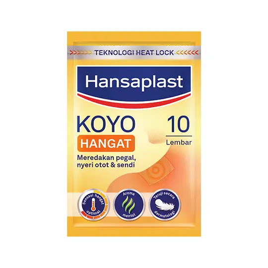 HANSAPLAST KOYO HANGAT merupakan koyo yang mengandung bahan aktif camphor, menthol dan nonivamide. Kandungan bahan aktif pada produk ini memberikan rasa hangat yang menenangkan, membantu meredakan nyeri pada otot yang sakit, merangsang sirkulasi darah dan memblokir transimi sinyal rasa sakit.
