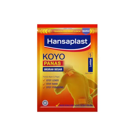 HANSAPLAST KOYO PANAS meredakan nyeri tepat pada otot yang sakit dengan sensasi panas yang tahan lama. Bahan aktif camphor, menthol dan nonivamide memberikan sensasi panas yang menenangkan dan merangsang sirkulasi darah. Di saat yang bersamaan, Hansaplast Koyo akan memblokir transimi sinyal rasa sakit. Dengan Hansaplast Koyo, Anda akan merasa lebih baik dan bisa kembali beraktivitas.