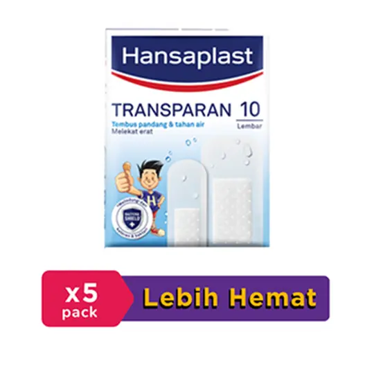 Hansaplast Transparan cocok untuk bagian tubuh yang terlihat karena terbuat dari bahan yang tembus cahaya, sehingga penggunaan plester tidak mudah disadari dan hampir tidak terlihat. Hansaplast Transparan tersedia dalam ukuran standar dan jumbo sehingga mampu menutup luka secara keseluruhan.