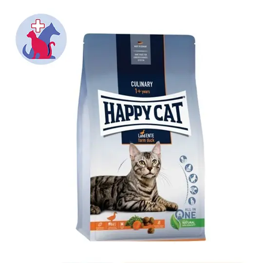 Makanan kucing grain free Happy Cat Culinary Farm Duck untuk kucing dewasa di atas umur 1 tahun. Culinary tersedia dalam berbagai pilihan rasa untuk si pecinta daging. Terbuat dari lezatnya daging bebek, wortel, dan kacang polong. Protein hewani yang tinggi sangat baik untuk mendukung massa otot. Resep grain free (bebas biji-bijian) dan kandungan prebiotik ideal untuk kucing dengan pencernaan sensitif.