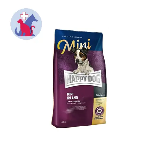 HAPPY DOG SUPREME MINI IRLAND merupakan makanan lengkap untuk anjing dewasa dengan berat hingga 10 kg. Produk ini mengandung salmon dan daging kelinci, tanpa domba atau ayam, tanpa beras, kedelai dan gandum.