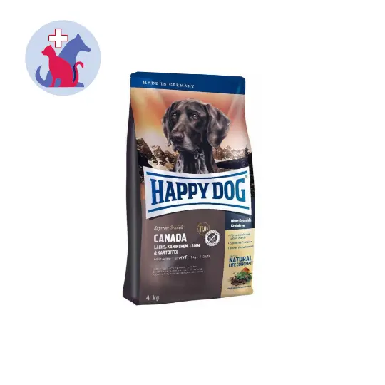HAPPY DOG SUPREME SENSIBLE CANADA GRAINFREE merupakan makanan untuk anjing dewasa aktif dengan kebutuhan energi yang lebih tinggi. Produk ini dibuat dengan salmon halus, kelindi dan domba ditambah dengan kentang bebas gluten.
