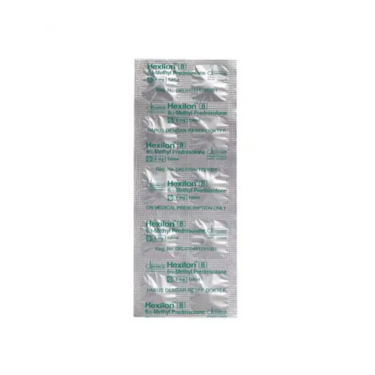 Hexilon 8 mg 10 Tablet mengandung Methylprednisolone. Methylprednisolone merupakan obat kortikosteroid sistemik yang digunakan untuk menekan reaksi peradangan dan alergi yang berat pada berbagai kondisi medis.