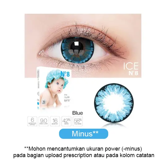 Softlens ICE NO8 untuk penggunaan 6 Bulan. Spesifikasi Produk: Base Curve: 9.00 mm Diameter: 16 mm Kadar Air/Water Content: 42% Masa Pakai/Recommended Usage: 6 Bulan/Monthly Warna/Color: Warna Blue Ukuran/Power Range: -0.5 s/d -6.00 (Step 0.25) Isi/Content: 2 buah (1 pasang)