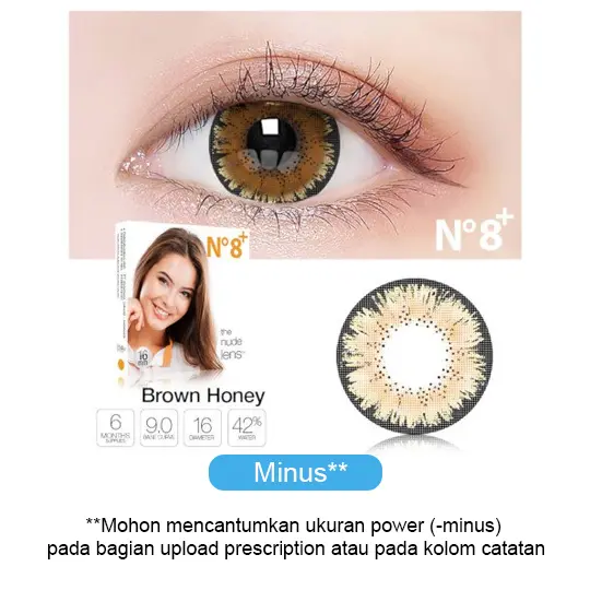 Softlens ICE NO8+ merupakan softlense dengan masa penggunaan 6 Bulan. Softlens ini memilki 5 varian warna yaitu Black Honey, Brown Honey, Navy, Grey Honey, dan Aqua Honey. Softlense ini memiliki kadar air 42% dan diameter 16 mm sehingga nyaman digunakan.