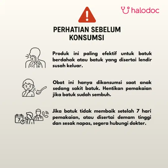 Simpan dibawah suhu 30 C. Gunakan sesuai dosis yang dianjurkan untuk anak. Hentikan pemakaian jika terjadi reaksi alergi. Sesuai anjuran umum untuk produk yang mengandung Echinacea, tidak dianjurkan untuk digunakan lebih dari 8 minggu secara berturut-turut. Jika batuk tidak membaik setelah 5-7 hari penggunaan atau disertai demam tinggi, sesak napas, atau gejala lain yang mengkhawatirkan, segera konsultasikan dengan dokter.
