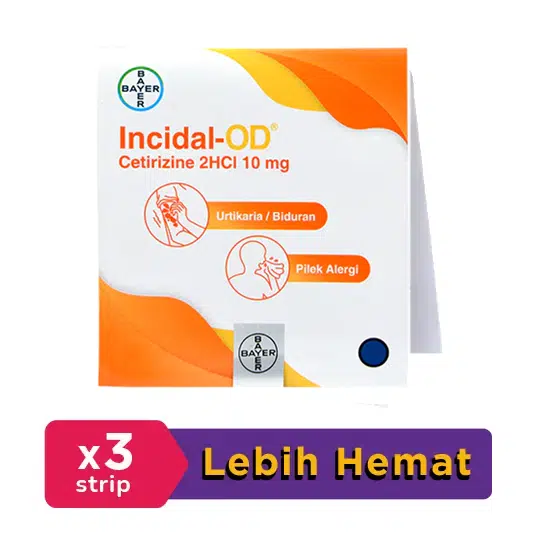 INCIDAL-OD mengandung cetirizine hidroklorida, suatu agen antihistamin generasi kedua yang mekanisme kerjanya melibatkan antagonisme selektif terhadap reseptor histamin H1 perifer. Indikasi penggunaan obat ini mencakup penanganan simptomatik berbagai manifestasi alergi, seperti rinitis alergi, baik musiman maupun perenial, yang ditandai dengan bersin, rinore, kongesti nasal, pruritus okular, dan lakrimasi. Selain itu, Incidal-OD juga efektif untuk meredakan pruritus yang terkait dengan urtikaria kronis idiopatik. Dengan menghambat ikatan histamin pada reseptornya, cetirizine secara efisien mereduksi respons inflamasi alergi, memberikan pemulihan dari gejala-gejala tersebut dengan profil sedasi yang lebih rendah dibandingkan antihistamin generasi sebelumnya.