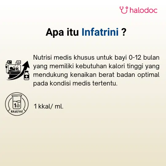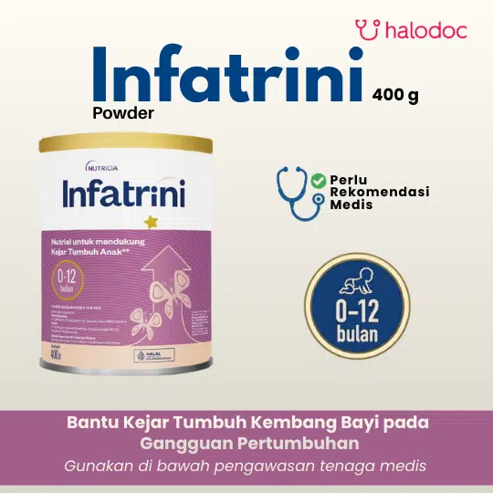 INFATRINI POWDER adalah Pangan Olahan untuk Keperluan Medis Khusus (PKMK) yang diformulasikan khusus untuk anak usia 0–12 bulan dengan indikasi Beresiko Gagal Tumbuh, Gizi Kurang & Gizi Buruk Pangan Olahan Keperluan Medis Khusus Untuk Dukungan Nutrisi Bagi Anak Berisiko Gagal Tumbuh, Gizi Kurang, dan/atau Gizi Buruk Untuk Bayi Usia 0 - 12 Bulan dengan Energi 1 kkal/ml. PENTING! Air Susu Ibu (ASI) adalah yang terbaik bagi bayi. Produk ini bukan pengganti ASI dan hanya digunakan atas resep dokter. PKMK: Pangan Olahan untuk Keperluan Medis Khusus, Penggunaan produk PKMK harus dengan resep dokter