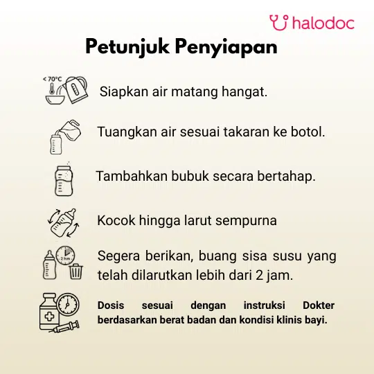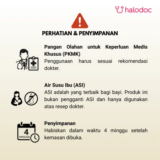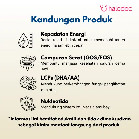 Produk ini diindikasikan sebagai sumber nutrisi bagi bayi usia 0-12 bulan yang mengalami gagal tumbuh (faltering growth), gizi kurang, atau memiliki peningkatan kebutuhan energi akibat kondisi medis tertentu (misalnya penyakit jantung bawaan, infeksi kronis, atau kondisi pra/pasca operasi). Penggunaannya bertujuan untuk memberikan asupan kalori dan nutrisi yang padat dalam volume pemberian yang lebih sedikit, sehingga membantu meningkatkan berat badan dan mendukung pencapaian pertumbuhan yang optimal. Penggunaan sesuai dengan rekomendasi dan indikasi medis dari dokter.