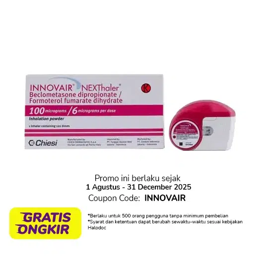 Innovair Nexthaler 100/6 mcg 120 Dosis merupakan obat yang mengandung Beclomethasone dipropionate dan formoterol fumarate dihydrate. Beclomethasone dipropionate merupakan salah satu obat golongan kortikosteroid yang bekerja sebagai anti radang yang akan mengurangi radang arau pembengkakakan pada kantung-kantung udara yang terletak di ujung saluran udara terkecil (bronkiolus) di dalam paru-paru. Sedangkan, Formoterol fumarate dihydrate bekerja sebagai bronkodilator, yaitu obat yang akan memperlebar saluran nafas, sehingga proses bernafas dan pertukaran antara oksigen dan karbondioksida menjadi lebih mudah. INNOVAIR nexthaler digunakan untuk meringankan gejala mengi dan sesak nafas sebagai terapi pada pada penderita asma. Dalam penggunaan obat ini harus SESUAI DENGAN PETUNJUK DOKTER. Pembelian obat ini memerlukan edukasi terkait penggunaan atau pengonsumsian obat yang tepat dan aman yang akan dikenakan biaya.