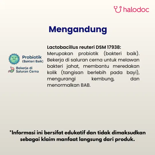 Bahan aktif: Lactobacillus reuteri DSM 17938 100.000.000 CFU. Bahan tambahan: