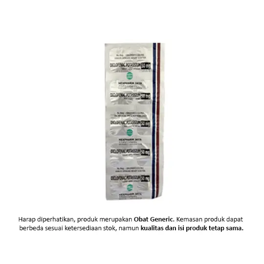 Kalium Diklofenak 50 mg 10 Tablet adalah obat pereda nyeri yang mengandung Kalium Diklofenak. Kalium Diklofenak merupakan obat antiinflamasi nonsteroid (AINS) yang bekerja dengan menghambat produksi prostaglandin, zat yang berperan dalam proses peradangan, nyeri, dan demam, sehingga memberikan efek antiinflamasi, analgesik, dan antipiretik. Obat ini digunakan untuk meredakan nyeri ringan hingga sedang yang terkait dengan berbagai kondisi seperti nyeri haid (dismenore primer), nyeri otot dan sendi, nyeri akibat cedera atau trauma, nyeri pascaoperasi, nyeri gigi, serta kondisi peradangan lainnya.