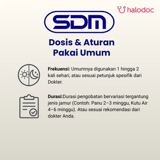 Durasi Pengobatan: P. Versikolor (2-3 minggu), T. Korporis (3-4 minggu), T. Pedis (4-6 minggu), T. Kruris (2-4 minggu), Infeksi ragi (2-3 minggu), Dermatitis Seboroik (2-4 minggu)