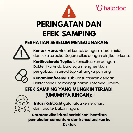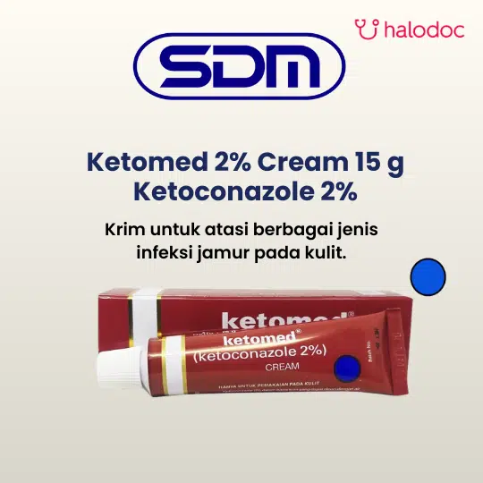 Ketomed 2% Cream mengandung Ketoconazole 2%. Ketoconazole 2% adalah obat antijamur topikal digunakan untuk mengatasi infeksi jamur pada kulit dan kulit kepala, seperti panu, kurap, kutu air, kandidiasis kulit, serta dermatitis seboroik (ketombe). Obat ini bekerja dengan menghambat produksi ergosterol pada membran sel jamur, sehingga merusak sel jamur dan menghentikan pertumbuhannya. Cara penggunaan krim dioleskan tipis pada area kulit yang terinfeksi 1-2 kali sehari atau sesuai petunjuk dokter. Efek samping yang mungkin terjadi meliputi rasa perih, gatal, kering, atau kemerahan pada kulit di area aplikasi, namun biasanya bersifat ringan dan sementara. Hindari kontak dengan mata, mulut, atau luka terbuka, dan bilas dengan air jika terkena area tersebut. Gunakan sesuai petunjuk dokter atau kemasan, serta lanjutkan pengobatan sampai selesai meskipun gejala sudah membaik untuk mencegah kekambuhan infeksi.