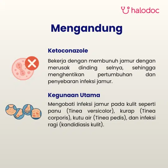 Durasi Pengobatan: P. Versikolor (2-3 minggu), T. Korporis (3-4 minggu), T. Pedis (4-6 minggu), T. Kruris (2-4 minggu), Infeksi ragi (2-3 minggu), Dermatitis Seboroik (2-4 minggu)