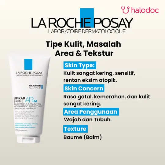 Tersedia 2 kemasan yaitu tube berwarna putih (kemasan lama) dan tube berwarna coklat eco friendly (kemasan baru). Produk yang dikirimkan sesuai dengan ketersediaan stock Apotek. La Roche Posay Lipikar Baume AP+M 200 ml adalah pelembap bertekstur baume (krim pekat) yang diformulasikan untuk membantu merawat kulit yang sangat kering, iritasi, dan rentan terhadap eksim atopik. Formulanya bekerja dengan menargetkan keseimbangan mikrobiom kulit, yaitu ekosistem mikroorganisme yang krusial untuk kesehatan kulit. Teknologi AP+M di dalamnya mengkombinasikan Aqua Posae Filiformis, bahan alami untuk membantu menyeimbangkan kembali mikrobiom, dengan bahan aktif baru Microrésyl yang membantu membatasi biofilm (lapisan pelindung) dari bakteri pemicu iritasi. Didukung oleh kandungan Shea Butter konsentrasi tinggi dan Niacinamide, baume ini bekerja untuk menutrisi secara intensif, membantu memperbaiki lapisan pelindung kulit (skin barrier), dan menenangkan rasa gatal serta kemerahan.