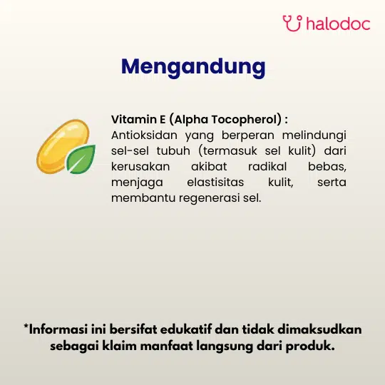 Vitamin E adalah suplemen antioksidan yang berperan melindungi sel-sel tubuh dari kerusakan akibat radikal bebas, serta membantu menjaga kesehatan kulit, daya tahan tubuh, fungsi saraf, dan sistem reproduksi. Vitamin ini bekerja dengan menetralisir oksidasi lemak di membran sel, sehingga mencegah kerusakan jaringan dan mendukung proses regenerasi sel. Efek samping jarang terjadi bila digunakan sesuai dosis, namun konsumsi berlebihan dapat menimbulkan mual, diare, sakit kepala, mudah lelah, atau meningkatkan risiko perdarahan karena mengganggu fungsi vitamin K. Suplemen ini sebaiknya digunakan sesuai anjuran dokter atau aturan pakai, terutama pada penderita gangguan pembekuan darah, penyakit hati, atau yang sedang mengonsumsi obat pengencer darah. Untuk hasil optimal, vitamin E dapat dikombinasikan dengan pola makan sehat dan kaya sumber alami vitamin E seperti kacang-kacangan, biji-bijian, dan minyak nabati.
