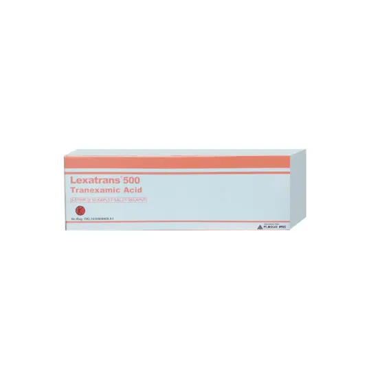LEXATRANS 500 MG KAPLET mengandung zat aktif asam Traneksamat yang berguna untuk fibrinolisis local seperti prostatektomi, konisasi serviks. Pendarahan abnormal sesudah operasi. Dalam penggunaan obat ini HARUS SESUAI DENGAN PETUNJUK DOKTER. Pembelian obat ini memerlukan edukasi terkait penggunaan atau pengonsumsian obat yang tepat dan aman yang akan dikenakan biaya.