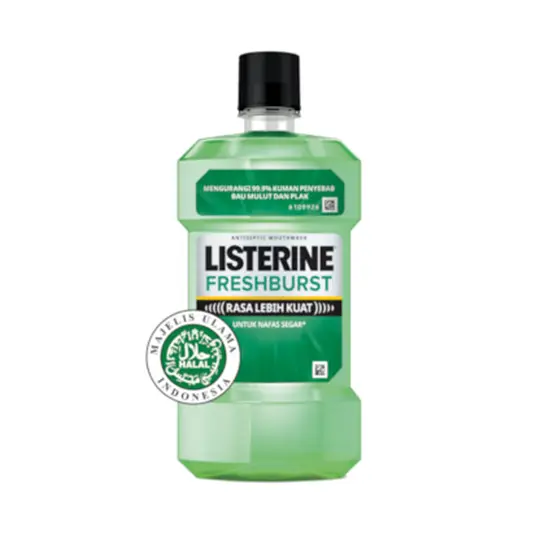 LISTERINE FRESH BURST MOUTHWASH merupakan Obat Kumur Antiseptik dengan rasa lebih kuat. Mampu mengurangi 99.9% kuman penyebab masalah mulut seperti bau mulut, plak dan masalah gusi, dengan rasa mint mulut ekstra bersih dan napas lebih segar hingga 12 jam di bandingkan hanya sikat gigi dan flossing saja. Mengandung 4 Essential Oil yaitu Eucalyptol, Menthol, Methyl Salicylate dan Thymol . Digunakan 2x sehari setelah meyikat gigi. Telah tersertifikasi HALAL oleh MUI.