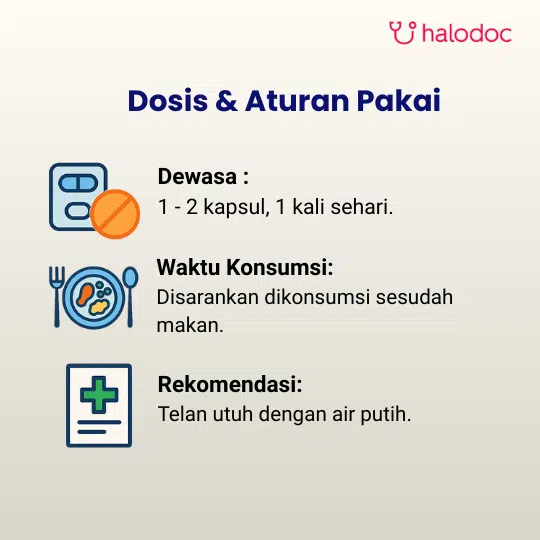 1 kapsul, diminum 1-2 kali sehari.