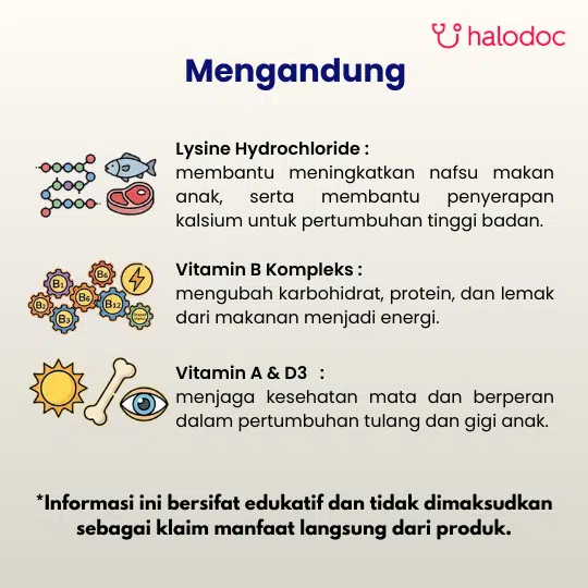 Kombinasi Vitamin A dan D yang penting untuk membantu menjaga kesehatan mata dan tulang. Vitamin B Kompleks (B1, B2, B6, B12, Nicotinamide, Dexpanthenol) di dalamnya berperan untuk membantu proses metabolisme tubuh dalam menghasilkan energi dan menjaga fungsi saraf. Penambahan Lysine HCl, sebuah asam amino esensial, bertujuan untuk membantu merangsang dan memperbaiki nafsu makan pada anak.
