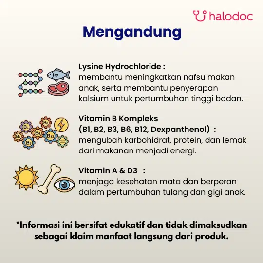 Kombinasi Vitamin A dan D yang penting untuk membantu menjaga kesehatan mata dan tulang. Vitamin B Kompleks (B1, B2, B6, B12, Nicotinamide, Dexpanthenol) di dalamnya berperan untuk membantu proses metabolisme tubuh dalam menghasilkan energi dan menjaga fungsi saraf. Penambahan Lysine HCl, sebuah asam amino esensial, bertujuan untuk membantu merangsang dan memperbaiki nafsu makan pada anak.