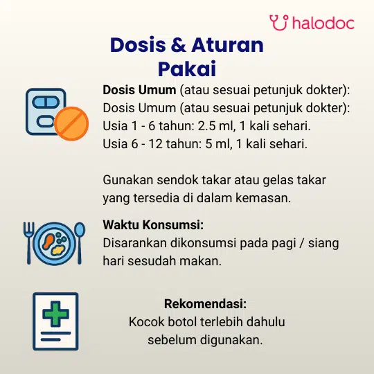 Anak usia di bawah 6 tahun: 1 kali sehari, 1/2 sendok takar (2,5 ml).