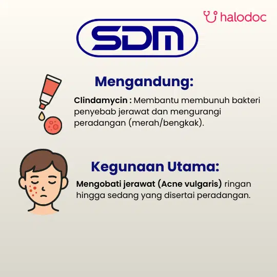 Informasi umum terkait kandungan: Jerawat seringkali disebabkan oleh pertumbuhan berlebih bakteri Propionibacterium acnes di dalam pori-pori kulit. Obat ini mengandung Clindamycin Phosphate, suatu antibiotik yang efektif melawan bakteri tersebut. Clindamycin bekerja dengan cara masuk ke dalam sel bakteri dan mengikat subunit ribosom 50S, sehingga menghambat proses sintesis protein bakteri. Tanpa protein yang cukup, bakteri tidak dapat berkembang biak dan akhirnya mati, membantu mengurangi jumlah bakteri pada kulit dan meredakan peradangan jerawat.