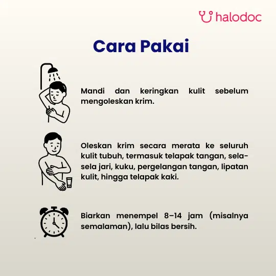 Oleskan secara merata pada seluruh permukaan kulit dari kepala sampai ke jari-jari kaki, terutama daerah belakang telinga, lipatan bokong dan sela-sela jari. Biarkan selama 8-12 jam, lalu cuci sampai bersih pada keesokan harinya. Jika selama pemakaian tidak sengaja tercuci, cream harus dioleskan kembali.