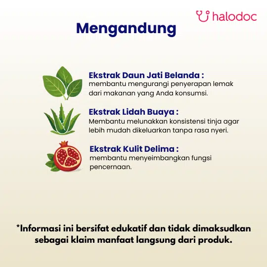*Informasi ini bersifat edukatif dan tidak dimaksudkan sebagai klaim manfaat langsung dari produk. Produk ini mengandung kombinasi berbagai ekstrak herbal. Ekstrak Daun Jati Belanda (Guazumae Ulmifolia Folium) secara tradisional digunakan untuk membantu menghambat penyerapan lemak di usus. Ekstrak Lidah Buaya (Aloe Vera) dikenal memiliki efek laksatif ringan yang dapat membantu melancarkan buang air besar. Ekstrak Kulit Buah Delima (Granati Fructus Cortex) ditambahkan karena kaya akan antioksidan dan dipercaya dapat mendukung kesehatan metabolisme.