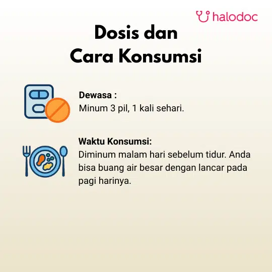 Dosis Umum: 3 pil, diminum 1 kali sehari sebelum tidur malam.