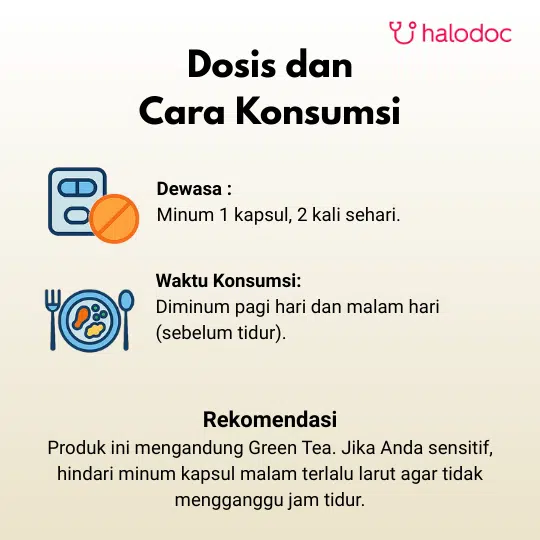 Diminum pada pagi dan malam hari, sebelum makan. Disertai dengan olahraga teratur, diet rendah kalori, dan rendah lemak.