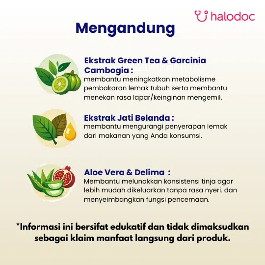 Tiap kapsul mengandung ekstrak dari: Camelia Sinensis Folium (Teh Hijau), Garcinia Cambogia Fructus (Asam Gelugur), Guazumae Ulmifolia Folium (Jati Belanda), Aloe Vera Folium (Lidah Buaya), Punica Granatum Pericarpium (Kulit Buah Delima).