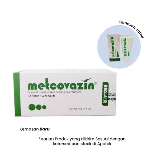 Metcovazin Salep Green merupakan salep kulit yang mengandung bahan aktif Chitosan + Zinc oxide. Salep ini digunakan untuk menjaga kelembaban dan membantu penyembuhan luka di kulit