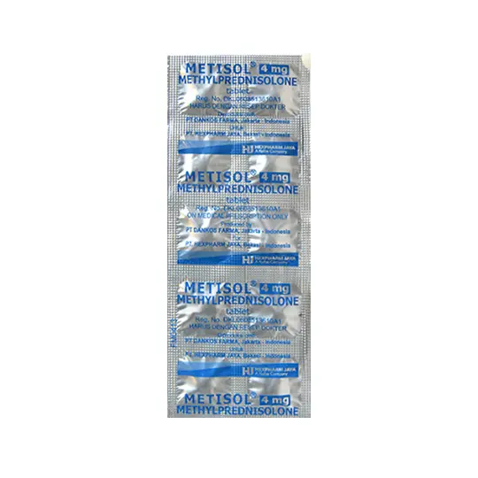 METISOL 4 adalah obat yang mengandung Methylprednisolone, suatu glukokortikoid sintetik turunan prednisolon. Obat ini memiliki efek antiinflamasi dan imunosupresif yang poten. Mekanisme kerjanya melibatkan ikatan dengan reseptor glukokortikoid intraseluler, yang setelah teraktivasi akan berikatan dengan daerah promotor DNA. Proses ini memodulasi transkripsi gen, baik mengaktivasi maupun menekan ekspresi gen tertentu, termasuk melalui deasetilasi histon, sehingga mengakibatkan penurunan produksi mediator inflamasi. PREDNICORT secara klinis diindikasikan untuk penanganan berbagai kondisi alergi dan inflamasi yang memerlukan terapi glukokortikoid, seperti pada penyakit autoimun, gangguan pernapasan, serta kondisi dermatologis dan reumatologis. Dalam menggunakan obat ini HARUS SESUAI DENGAN PETUNJUK DOKTER. Pembelian obat ini memerlukan edukasi terkait penggunaan atau pengonsumsian obat yang tepat dan aman yang akan dikenakan biaya.